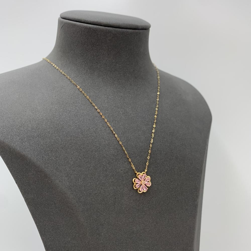 عقد ذهب عيار 18 بوزن 1.0 جرام بتصميم زهرة راقية مرصعة بأحجار وردية براقة تعكس جمالكِ الفريد. صنع بعناية فائقة ليكون إضافة أنيقة إلى إطلالتك اليومية أو مناسباتك الخاصة.