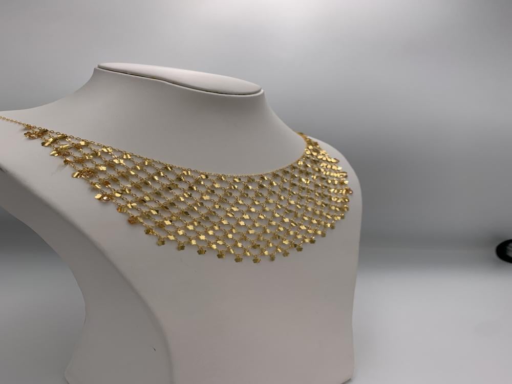 إذا كنتِ تبحثين عن قطعة ذهبية تخطف الأنظار، فهذا العقد هو كل ما تحتاجينه. تصميم شبكي فخم يغطي العنق بأناقة، وتفاصيل دقيقة متدلية تعكس فخامة الذهب وتميز الصناعة. مثالي للمناسبات الكبيرة واللحظات التي تستحق التألق الحقيقي.