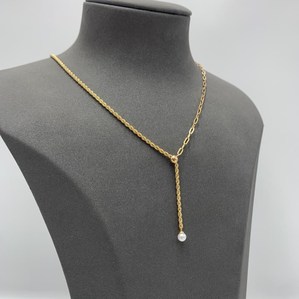 يتميز هذا العقد بسلسال ذهبي متين عيار 18 مع تدلية أنيقة تتوجها لؤلؤة لامعة تمنحك حضورًا راقيًا في جميع المناسبات.