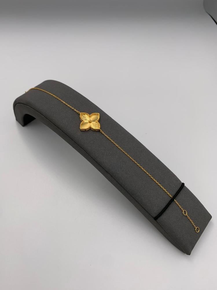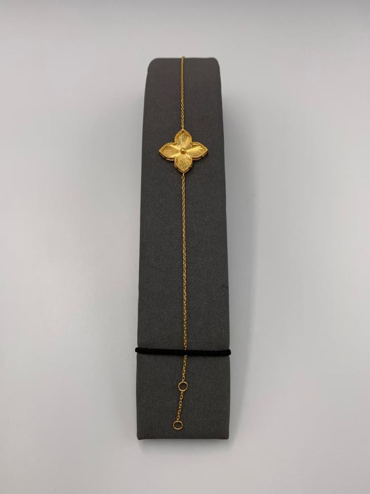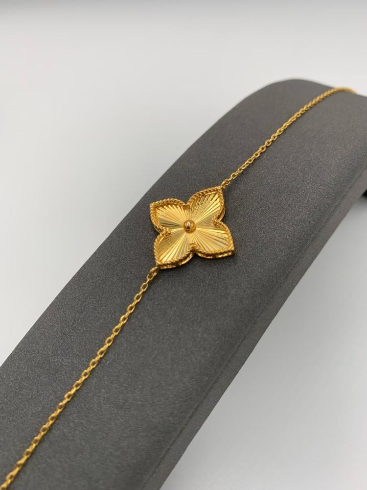تألقي بتصميم استثنائي مع هذه السوارة الإيطالية الفاخرة المصنوعة من ذهب عيار 21. تميزها الوردة الذهبية المنحوتة بدقة تمنحك إحساسًا بالفخامة والتفرّد في كل مناسبة.