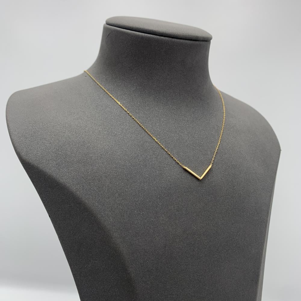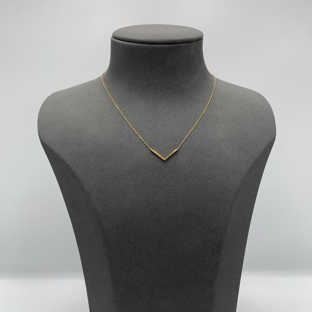 يتميز هذا العقد بسلسال ذهبي رفيع مزين بقطعة هندسية بشكل حرف V تمنحك إطلالة أنيقة تناسب الإطلالات اليومية والمناسبات الخاصة.
