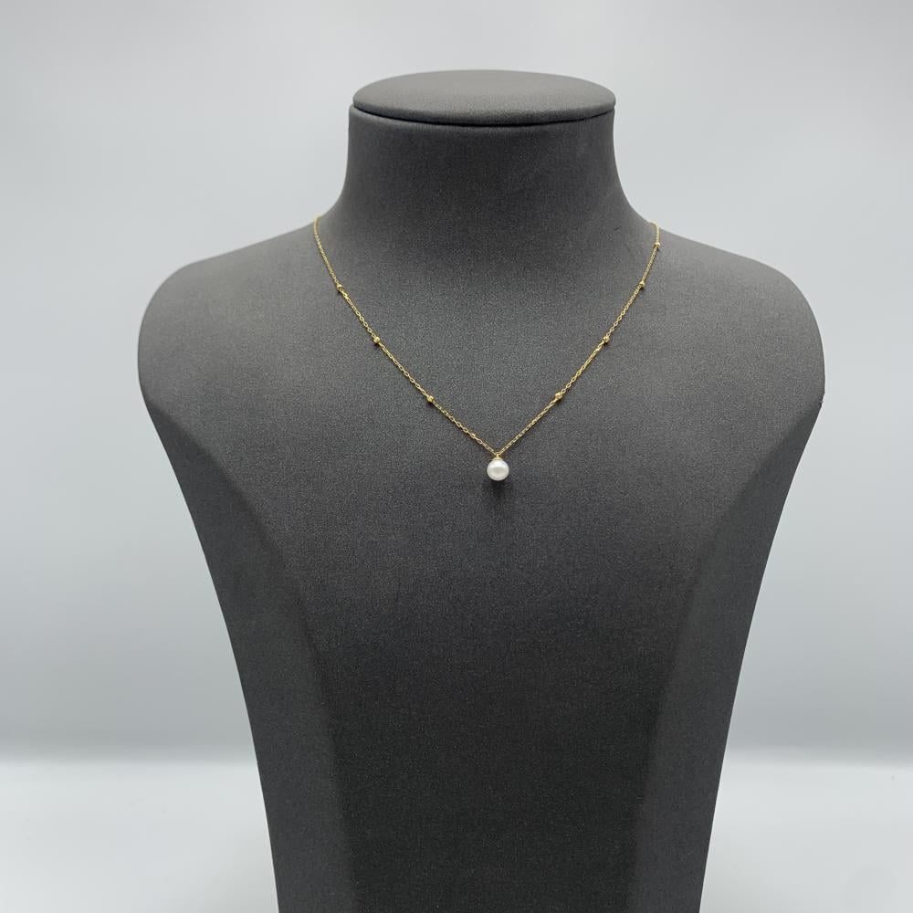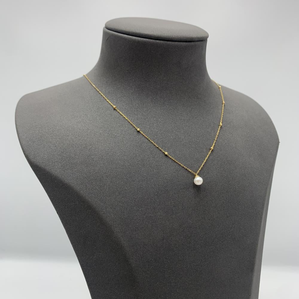 يتميز هذا العقد بسلسال ذهبي ناعم مرصع بكرات صغيرة أنيقة، تتدلى منه لؤلؤة طبيعية تضيف لمسة أنثوية راقية تناسب جميع الإطلالات اليومية والمناسبات الخاصة.
